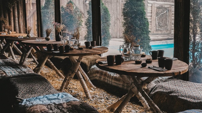 — велком-зона в трапезной приятно удивит гостей комплекса натуральным медом и вкусным чаем, чтобы подсластить прибывание в настоящей русской бане;