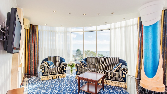 — площадь номера люкс 70 кв. м, 2 комнаты, гостиная с панорамными окнами;