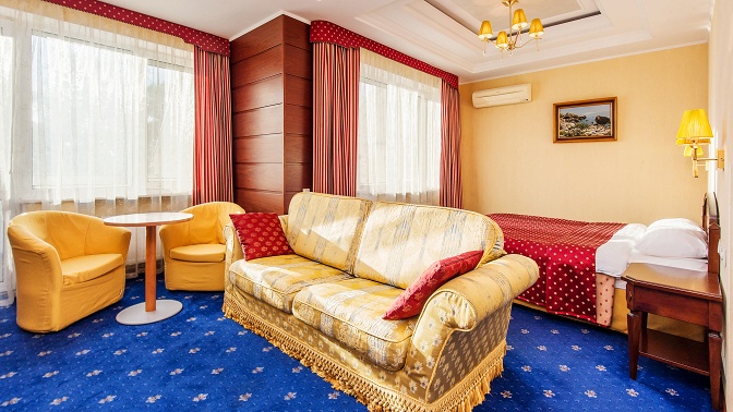 — площадь номера категории полулюкс — от 37 до 46 кв. м, номер оборудован широкой кроватью, мягкой раскладной мебелью, сейфом и холодильником;