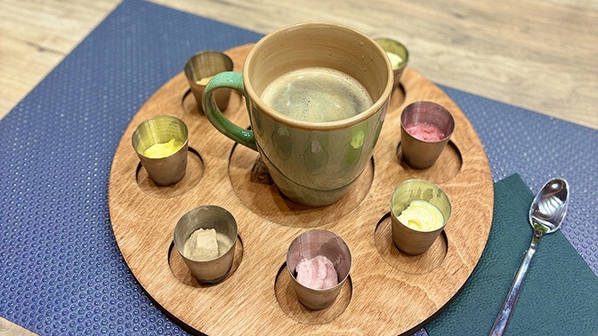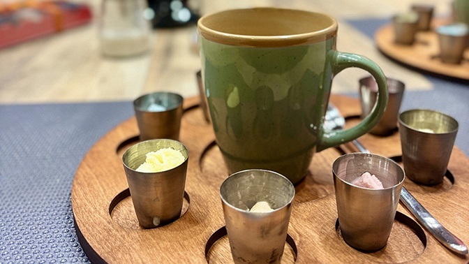 — вам будет предложено 4 сета по два вида мороженого (в комплекте с увлекательным рассказом о каждом вкусе, чтобы мороженое не успевало таять), а также горячий напиток на выбор;