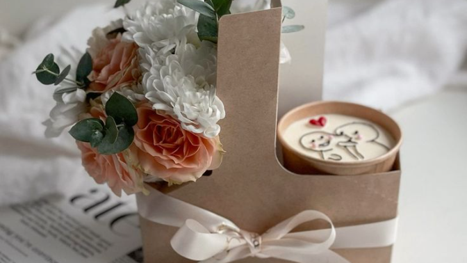 — подарочная упаковка (каждый участник забирает домой стаканчик с десертом и мини-букет из живых цветов с открыткой);