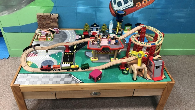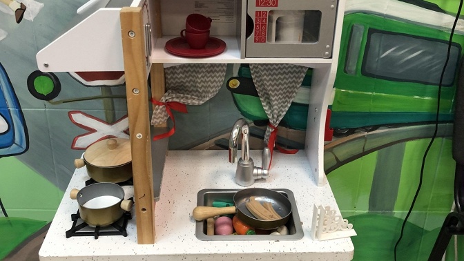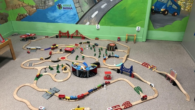 Вас ждет: деревянная железная дорога, лазалка-лабиринт, большой кукольный домик, кухня и гоночный трек-парковка Hot Wheels.