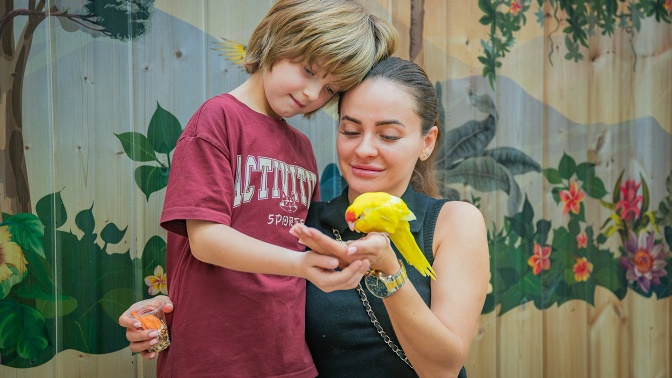— Скидка 30% на детский билет на посещение пространства с ручными попугаями в будние дни и утро пятницы (до 17:00) (630 руб. вместо 900 руб.)