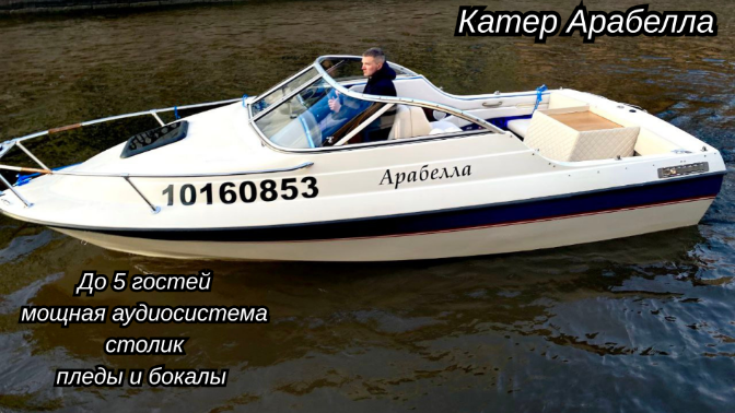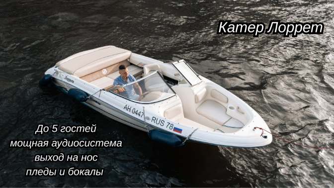 — Скидка 50% на прогулку на катере Sea Ray 175 (название «Лоррет») или катера «Арабелла» с капитаном для компании до 5 гостей (1 час) (5790 руб. вместо 11 580 руб.)