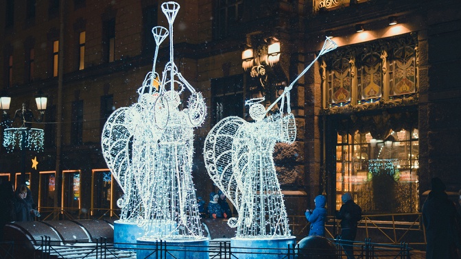 — Невский проспект, украшенный гирляндами и огнями;