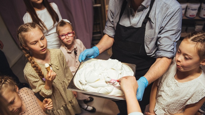 В программу входит дегустация бархатистого джелато, яркого фруктового сорбета, хрустящего рожка и эскимо, которое вы сами покрываете шоколадной глазурью. После экскурсии можно выбрать любой вкус и купить мороженое. Экскурсия подходит детям от 5 лет и взрослым, семьям и компаниям, а еще здесь созданы условия, чтобы необычно провести день рождения или другой праздник.