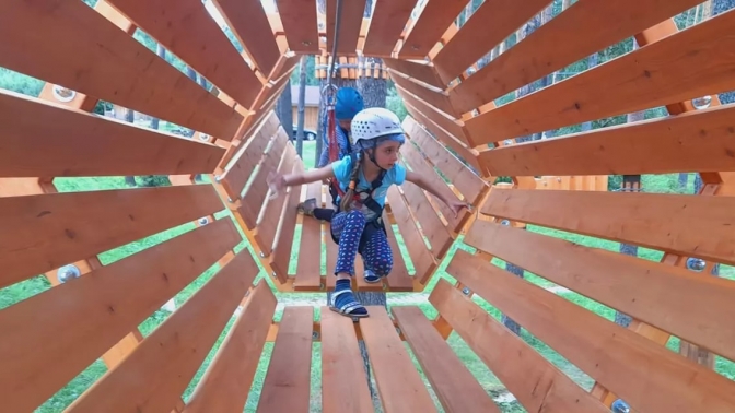 — трасса Kids: для взрослых и детей с 5 лет (от 120 см), включает в себя 20 переходов и 2 зип-лайна;