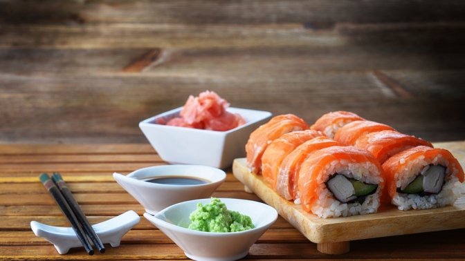 Подают суши и роллы традиционно с соевым соусом, маринованным имбирем и жгучим васаби. Такое сочетание вкусов удачно подчеркивает выразительность этих маленьких шедевров японской кухни. Попробуйте и убедитесь сами!