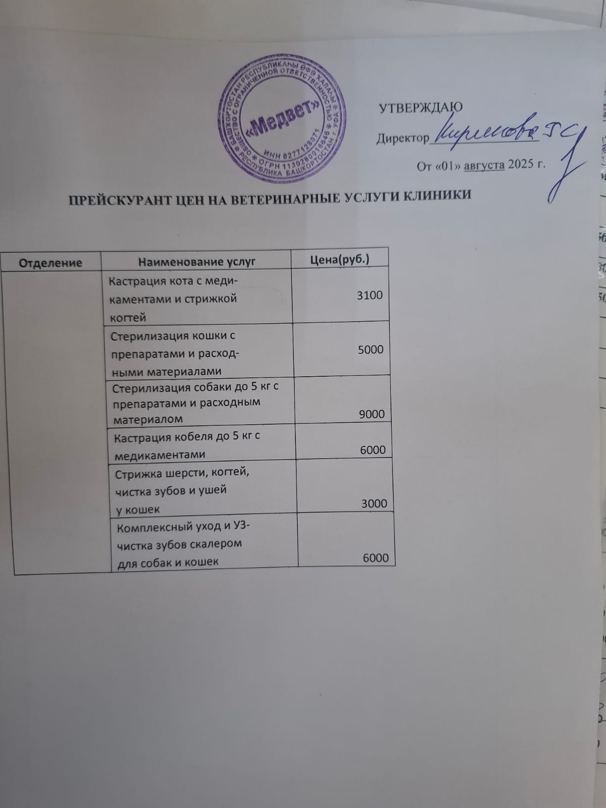 — стерилизация беременной кошки — от 500 до 1500 руб. (в зависимости от срока беременности);