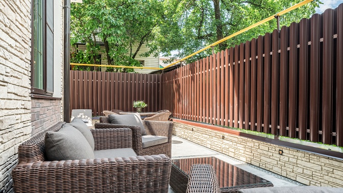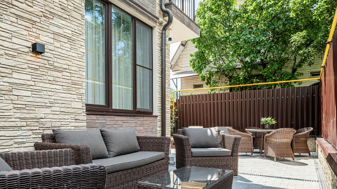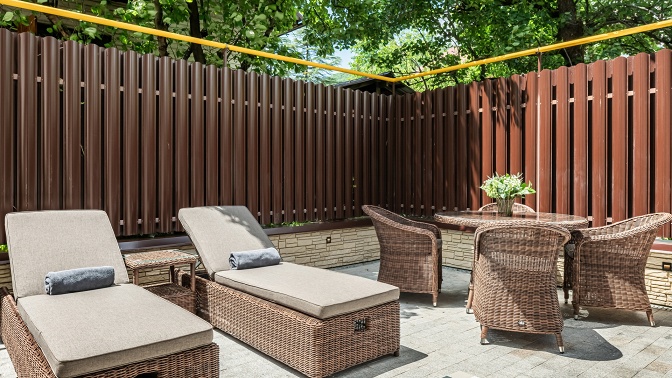— в патио расположены лежаки и мягкая зона для отдыха, площадь патио — 40–47 кв. м;