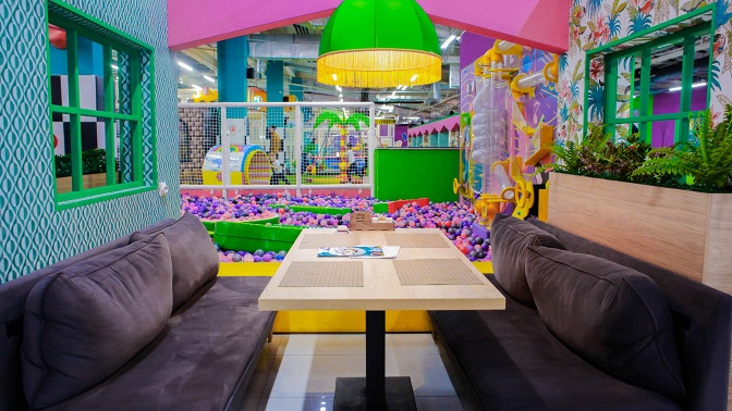 Огромное игровое пространство общей площадью более 2500 кв. м подходит для детей разных возрастов. Тут есть отдельная площадка для малышей с развивающими играми, интерактивными панелями и фигурами-животными, радужные сети и троллей-тарзанка, замок с пушками, скалодром, 2-уровневый веревочный парк, пневмолабиринт с огромным бассейном из шариков, батутная арена, горки и многое другое.