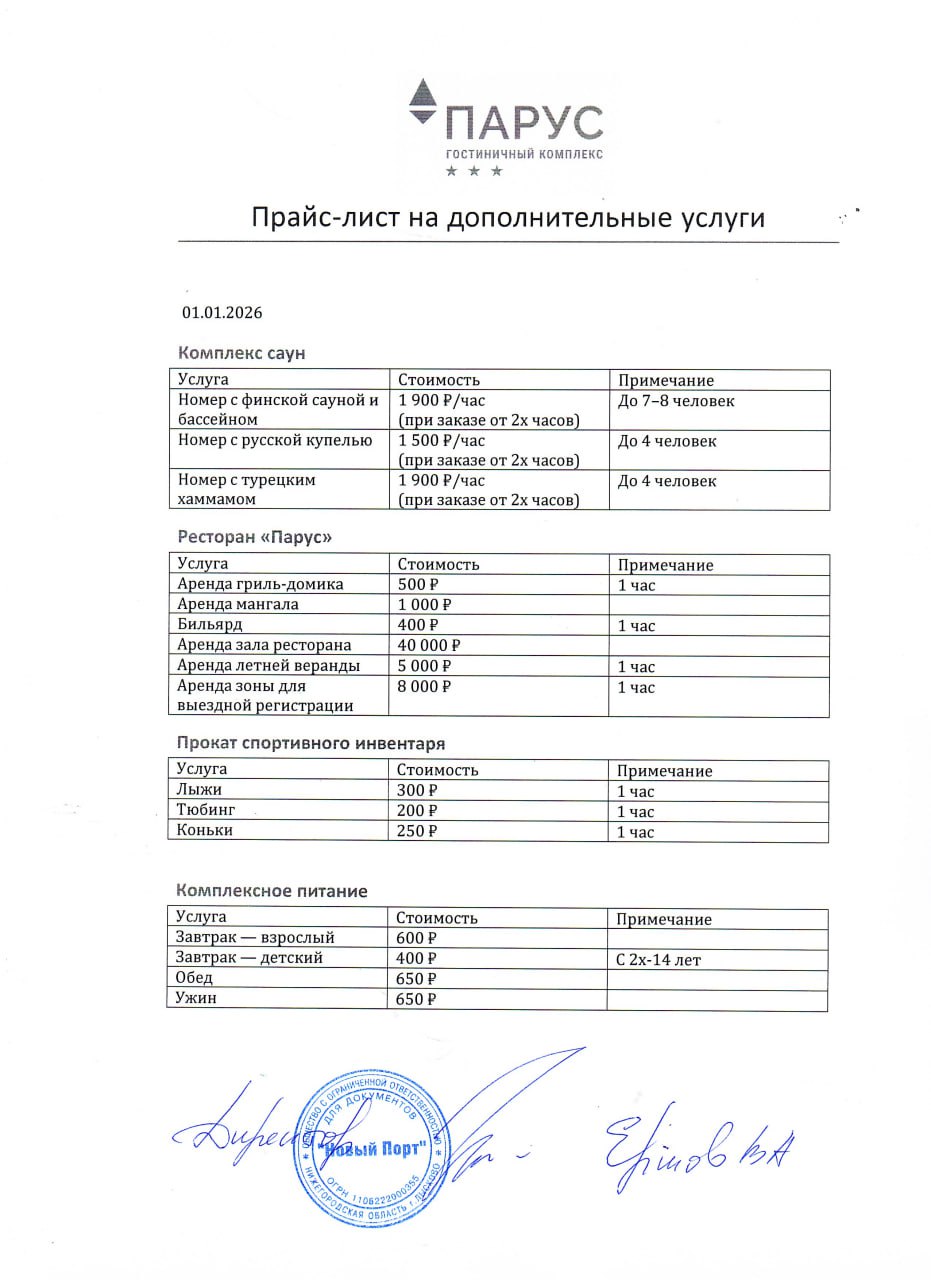 — катание на тюбинге — 2 часа (один раз за заезд на одни сутки)/4 часа (при заезде на 2 суток);